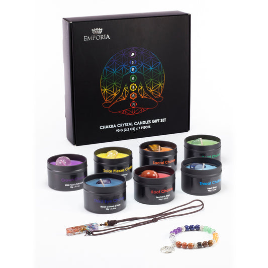 Csakra Aktiváló Szett 7 db XL méretű aromaterápiás szójaviasz gyertyával és drágakövekkel + AJÁNDÉK csakra nyaklánc és karkötő